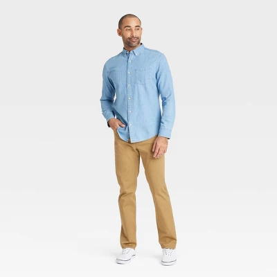 Elevate your everyday closet with this Every Wear Long-Sleeve Denim Shirt from Goodfellow & Co™. Tailored in a regular fit, the short-sleeve denim shirt is made from a midweight cotton-blend fabric for comfortable wear. It features a collared neckline with a button-front design, a chest patch pocket and buttoned cuffs, lending a polished look perfect for dressing up or down with chinos, jeans or trousers.